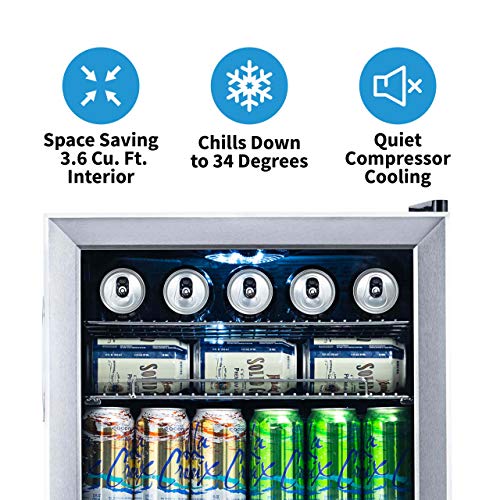 NewAir Beverage Refrigerator Cooler with 126 Can Capacity – Mini Bar Beer Fridge with Right Hinge Glass Door – Cools to 34F – AB-1200 – Stainless Steel