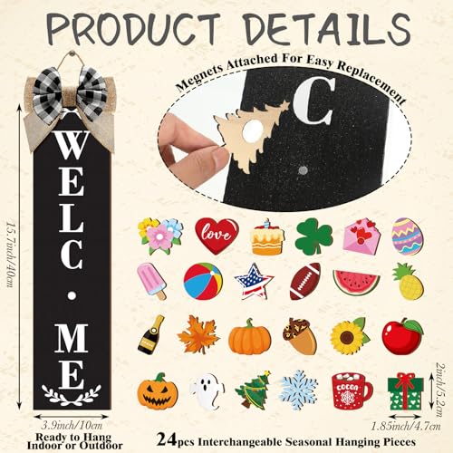 Interchangeable Design: the front door welcome sign is equipped with 24 pieces of small accessories, such as flowers, clover, pumpkins, hearts, maple leaves and more, designed with bright colors, exquisite and cute, you can use these small accessories to decorate porch, wall and so on