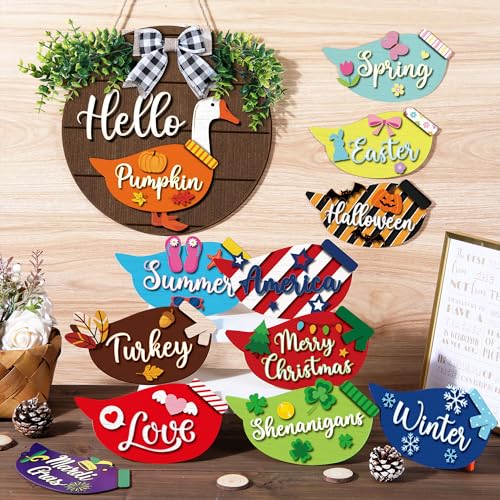 Weysat 13 Pcs Interchangeable Wooden Goose Decor, 11.8 Inch Holiday Seasonal Welcome Changeable Hello Geese Signs Rustic Farmhouse Front Door Round Wreaths Hanging Decorations for Porch Home Outdoor