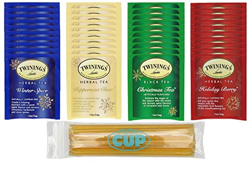 By The Cup Christmas Tea Bundle includes:40 Twinings Christmas flavored black and herbal teas; 10 of each flavor: Christmas, Winter Spice, Holiday Berry, and Peppermint Cheer By The Cup Honey Sticks: 100% Pure Domestic US Grade A Honey; No...