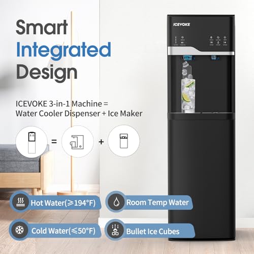 ICEVOKE 4-in-1 Self-Cleaning Water Dispenser with Ice Maker, Bottom Loading Hot & Cold Water Cooler for 3 or 5 Gallon Bottle – Includes Child Safety Lock & Nightlight – Water Machine for Home, Office